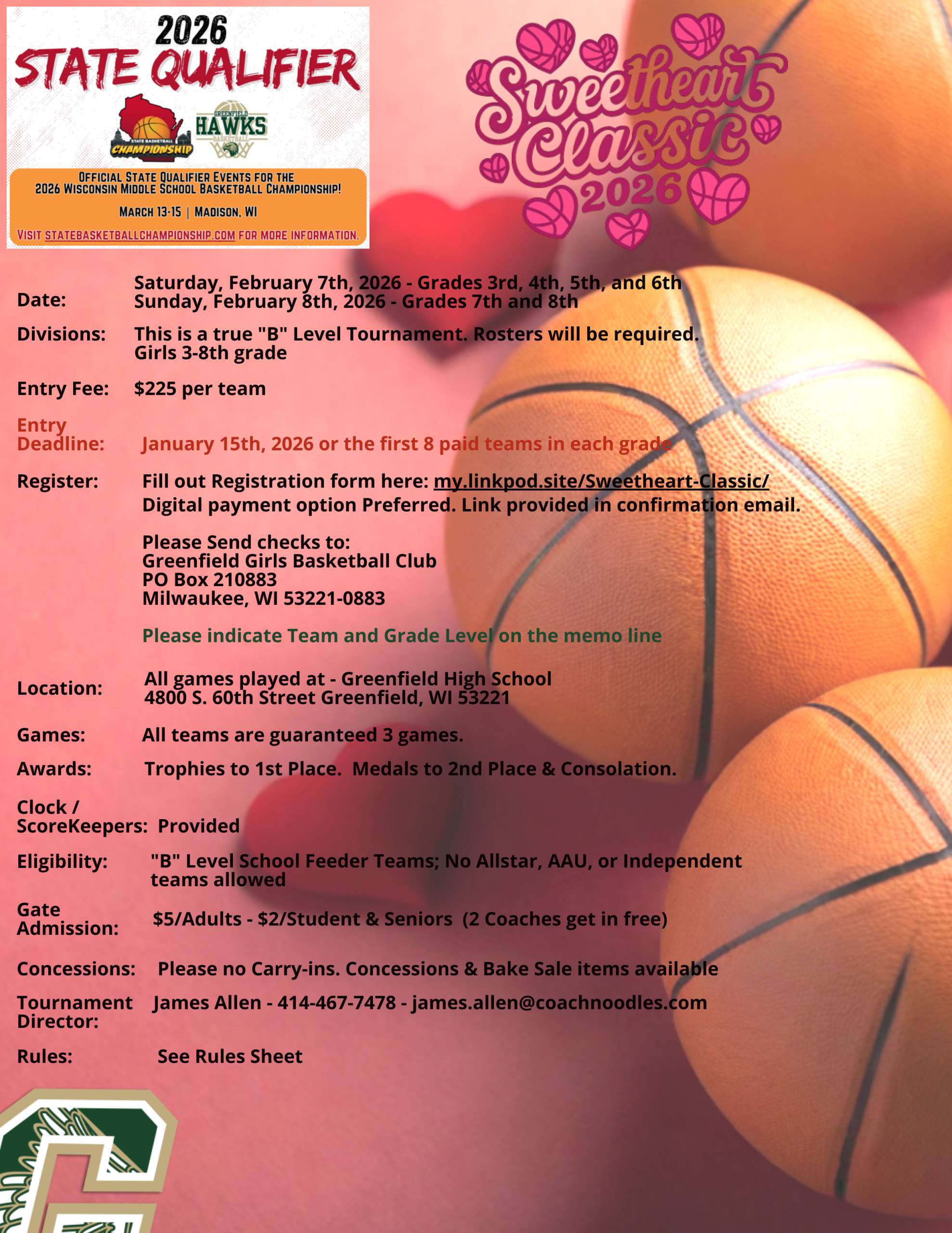 Mark your calendars — the Greenfield Girls Basketball Club invites you to our Annual “B” Level Sweetheart Classic Tournament!